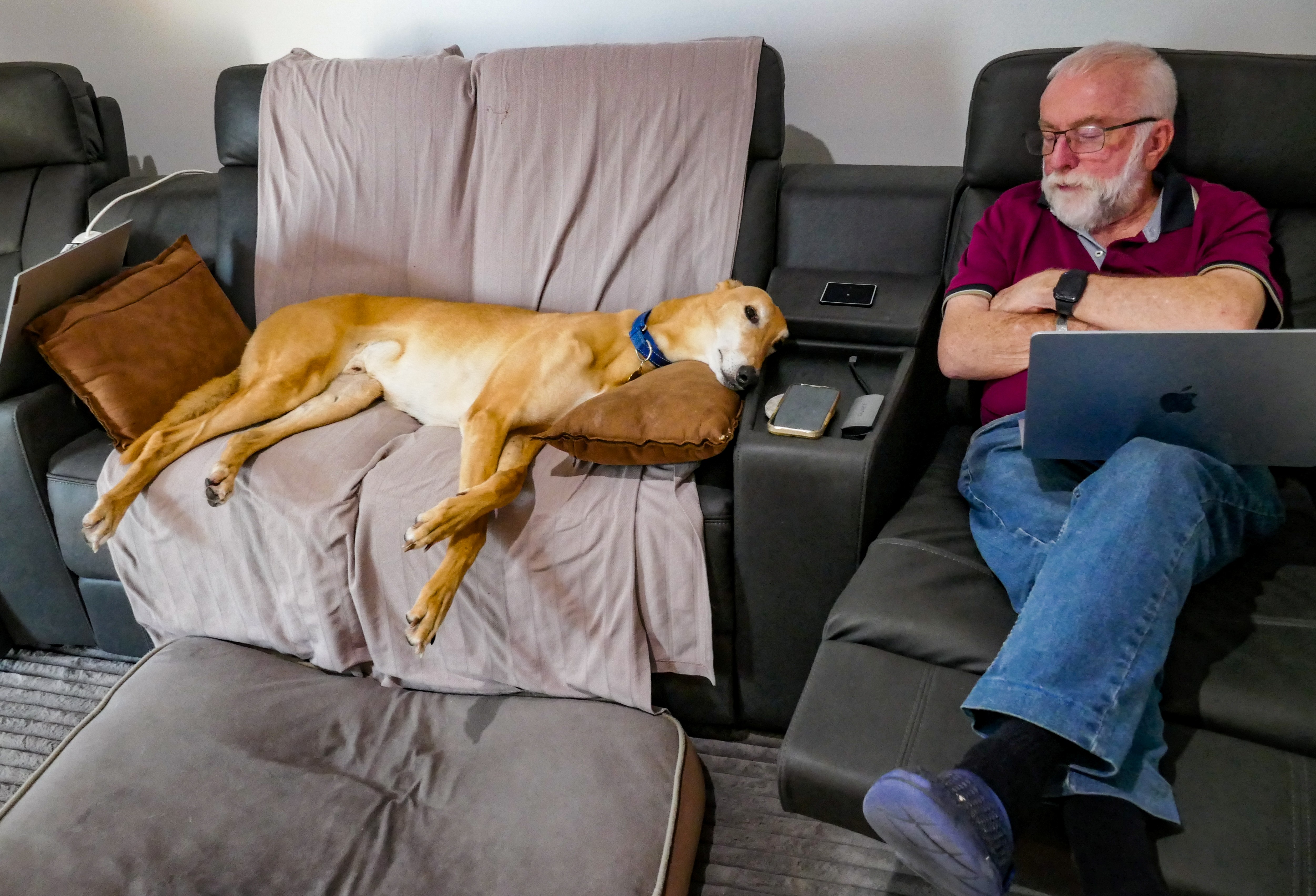 We returned from our house-sit yesterday and I thought you might like one last photo of Jensen, the retired greyhound, that we cared for for the week. He and Vince were good mates as you can guess from this photo of them both relaxing. As you can see, Jensen needed a two-seater couch all to himself.