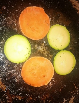 I used to fry zucchini in the skillet, but they eat a lot of oil, which I don’t like. What I started doing is cooking them in my Breville toaster oven. I cut them up into smaller slices, coat them them with olive oil, sea salt and spices, and then put them in the Breville to bake at 400° for about 25 minutes or so. If you don’t overcrowd the tray, they come out really good.