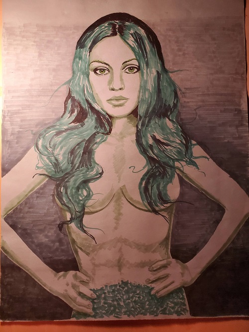 Friday, I ran errands and worked on some artwork. It's a large picture of a mermaid that is going to be done in soft pastel. I finished the "underpainting" in magic marker (I do that to improve coverage and save having to apply huge amounts of pastel). Here's a picture of it, but the color's not good - it was getting pretty dark by the time I finished. I'll post a better pic later.