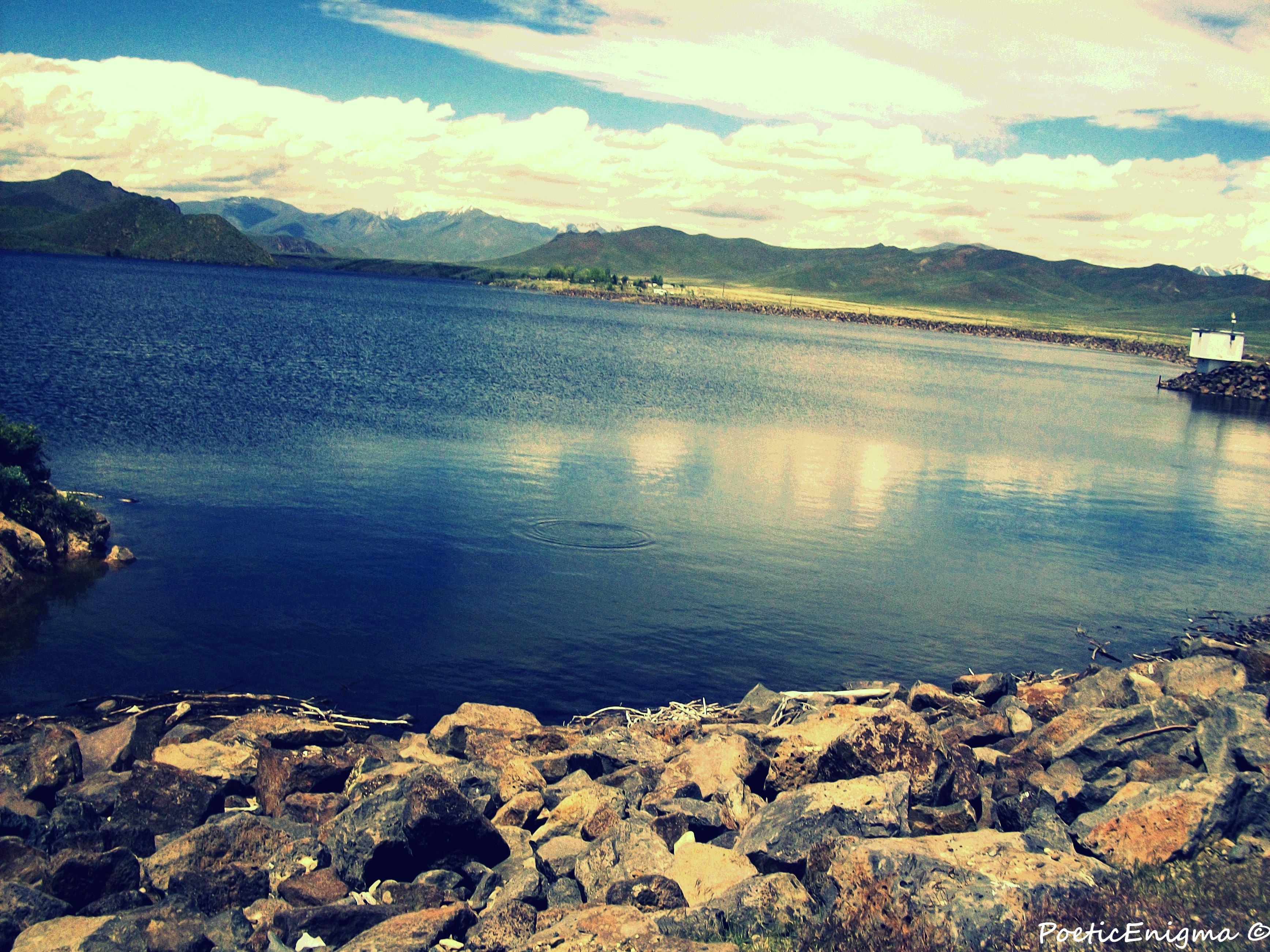 Wow, that’s pretty. So much to investigate: the lake, the rocky shoreline, the mountains, and those clouds!