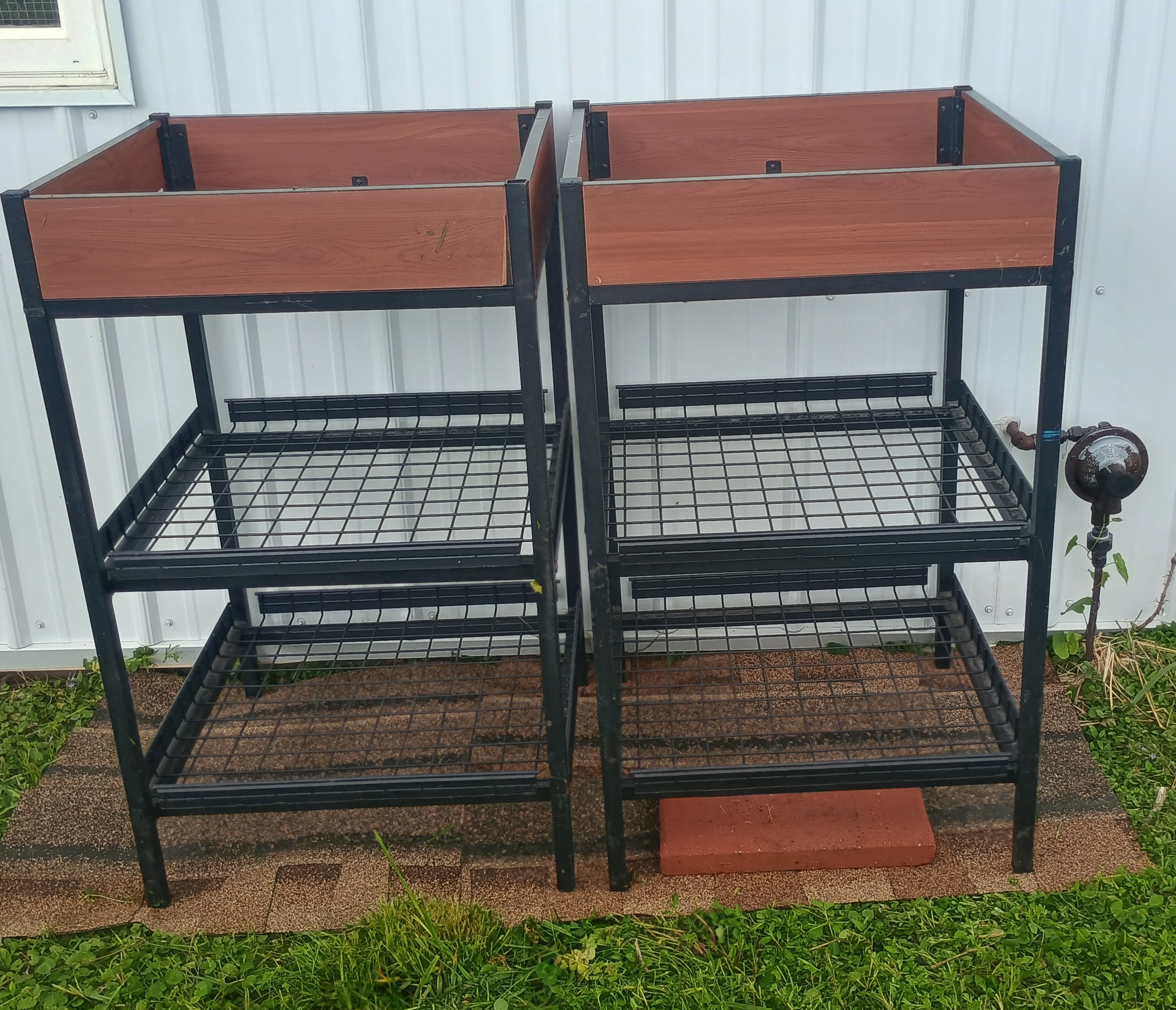 Third was the mowing so I could put the stands in place. I think they look very good there. And they are very easy to get to for taking care of my plants. Those are on them now.