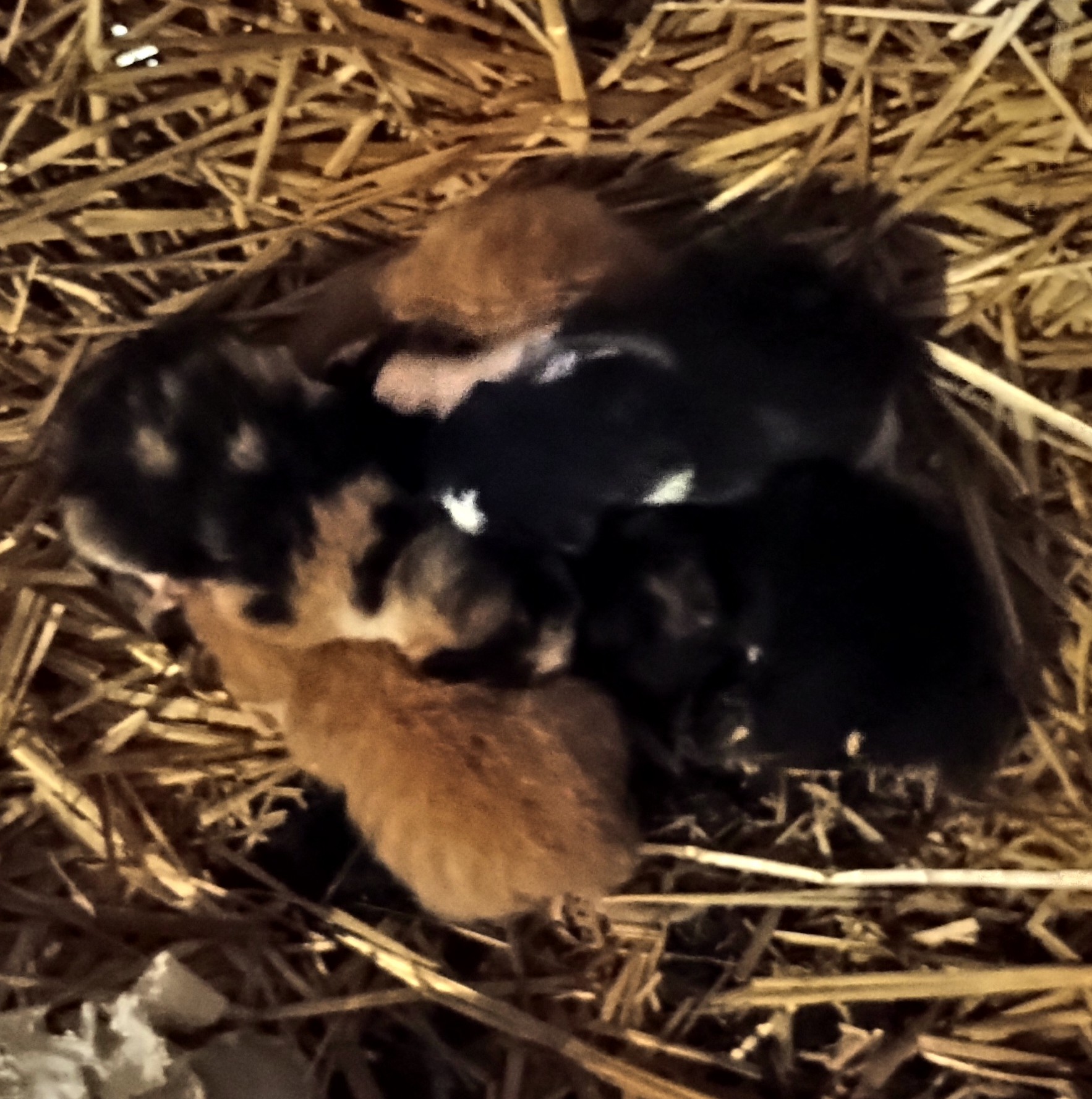 I know there is one all black and one black and white. Plus a calico. They are all doing good