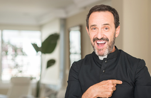 Photo is a stock photo from the internet of a minister laughing.