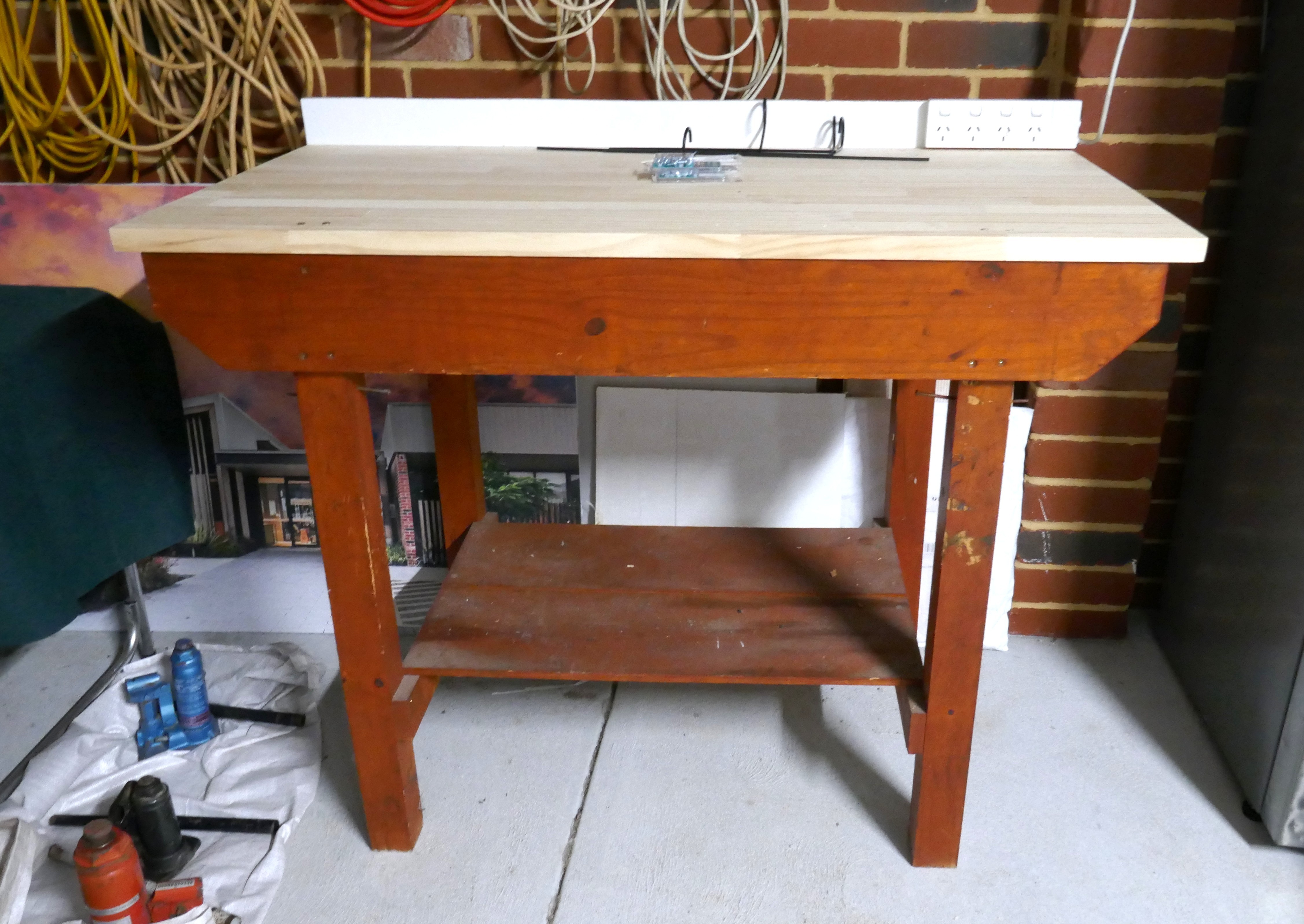 It was a bit tatty and the top was coming to bits so we bought a piece of laminated timber and have replaced the top. Vince has attached a four-pin plug so it will be quite useful for the few small jobs that we might want to use it for.